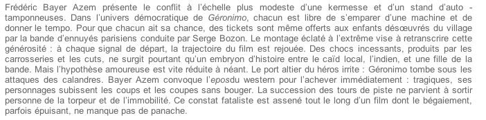 Un groupe de trentenaires branchés débarquent dans un village. Le jeune Géronimo, un as du volant, et ses amis les attendent de pied ferme. J'ai monté ce film de Frédéric Bayer Azem, produit par Aurora Films. Le film est en compétition au festival Coté Court 2014 de Pantin.